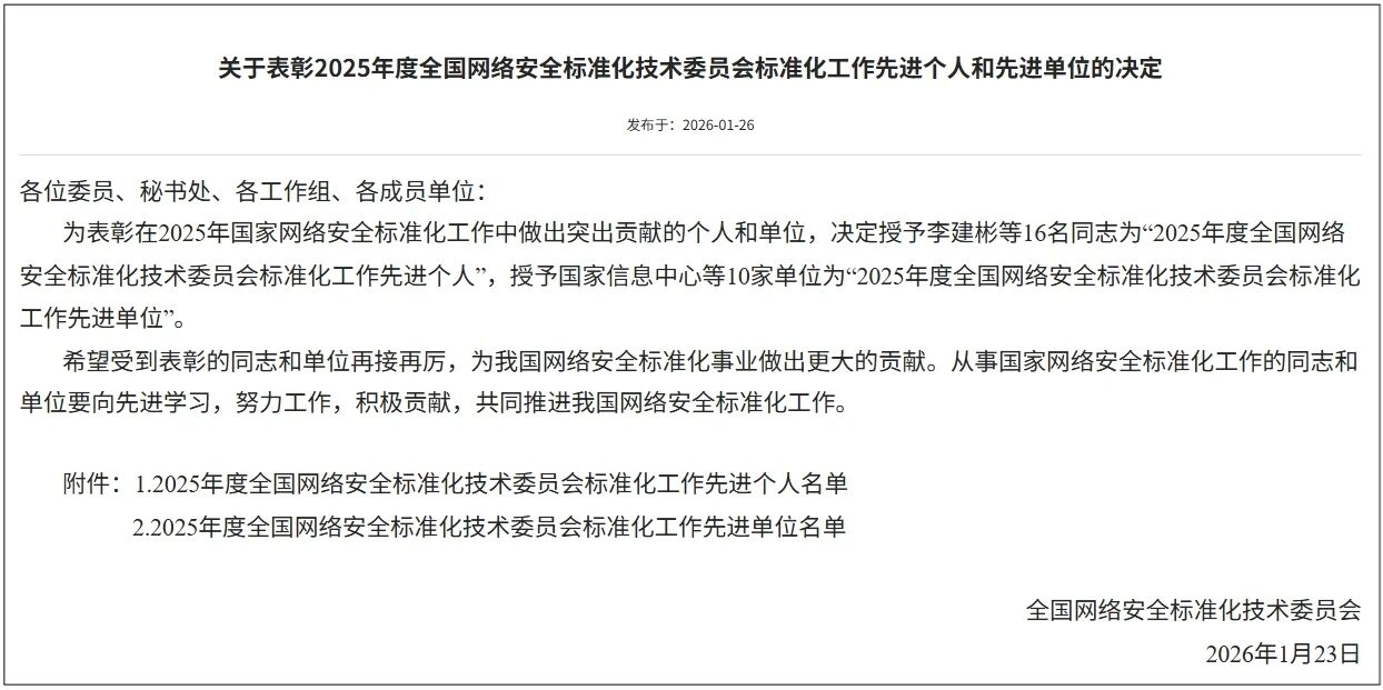 近期,全国网络安全标准化技术委员会(以下简称“网安标委”)发布《关于表彰2025年度全国网络安全标准化技术委员会标准化工作先进个人和先进单位的决定》,授予国家信息中心等10家单位为“2025年度全国网络安全标准化技术委员会标准化工作先进单位”。